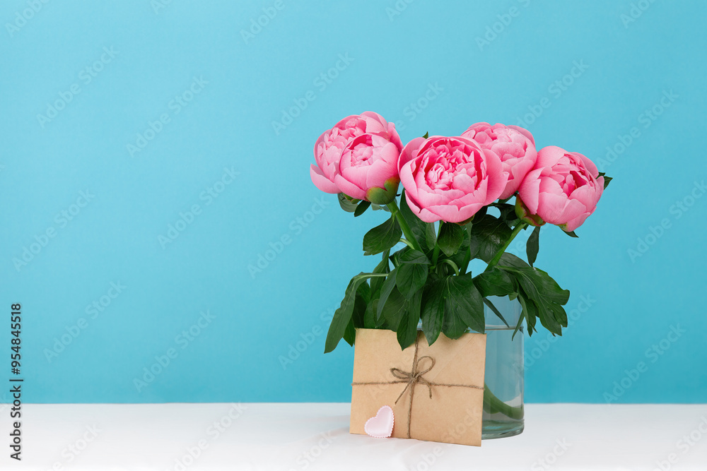 Pink Peonies in Vase with Gift Envelope on Blue Background
