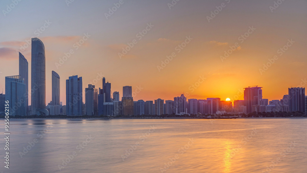 Abu Dhabi city skyline on sunrise time with water reflection timelapse.
