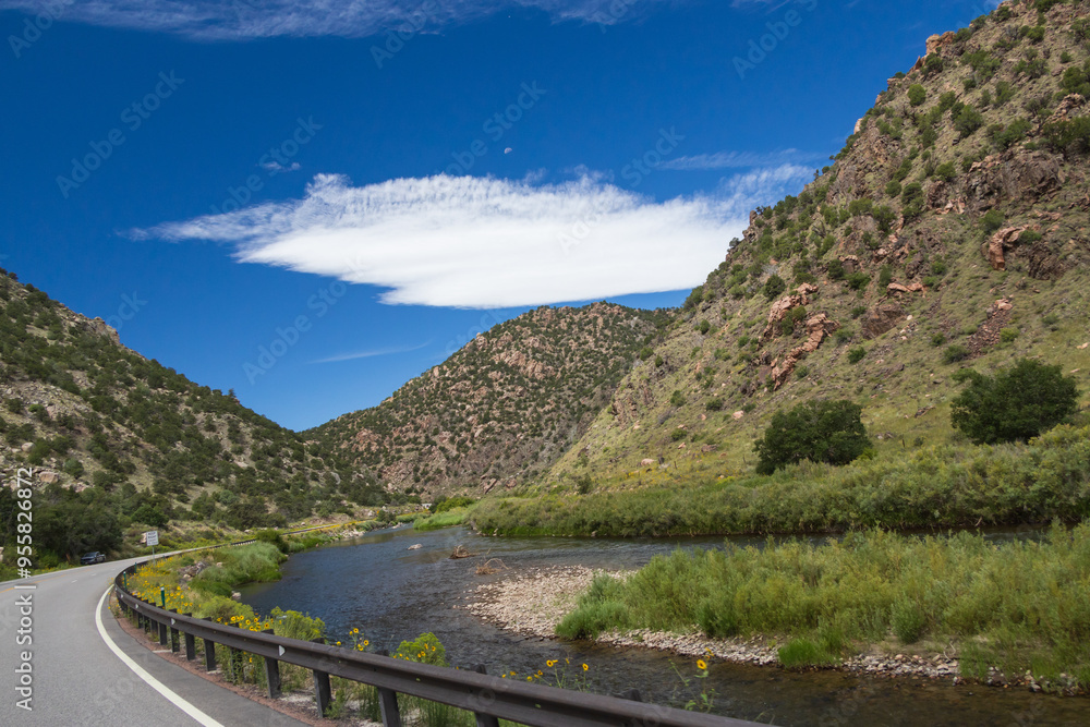Road beside the Arkansas River flowing through Royal Gorge Canyon, Colorado