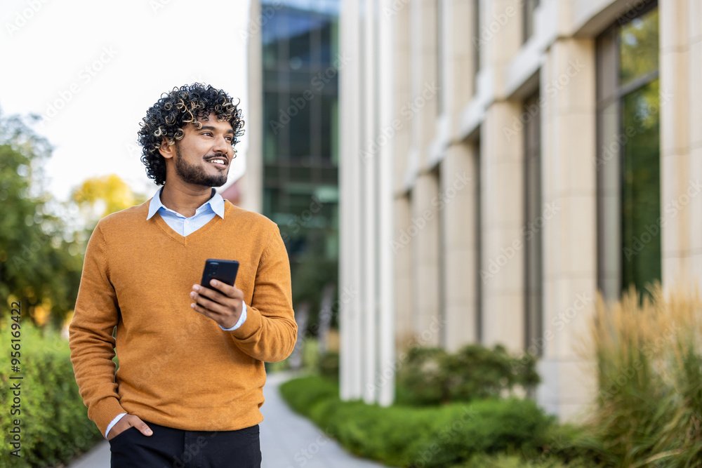 Hispanic businessman in orange sweater holding phone while walking outside office building. Smiling confidently and looking forward, showcasing modern urban work environment , professional lifestyle.