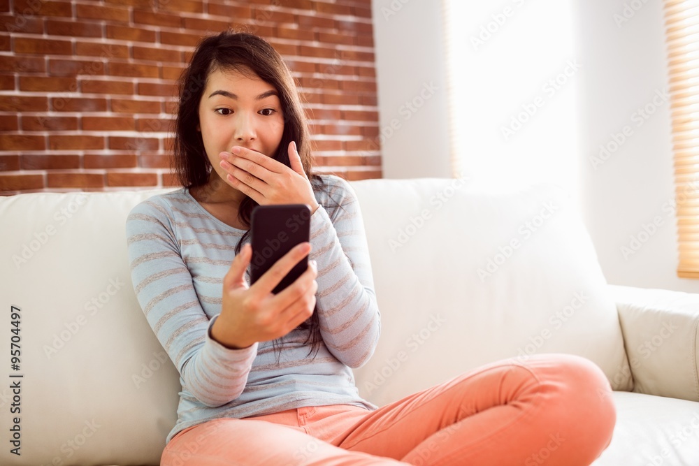 Asian woman reading shocking text