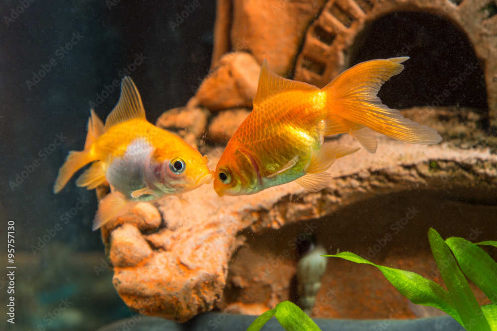 Two goldfish in the background cave in the aquarium