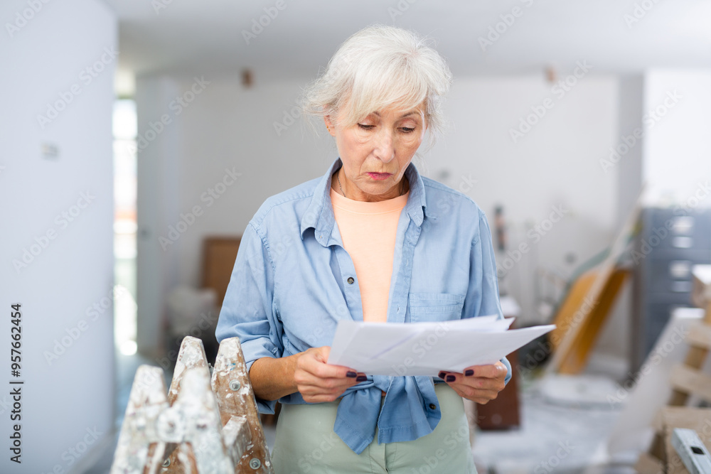Stressed mature woman homeowner examining room under reconstruction, having problems with documents of space planning
