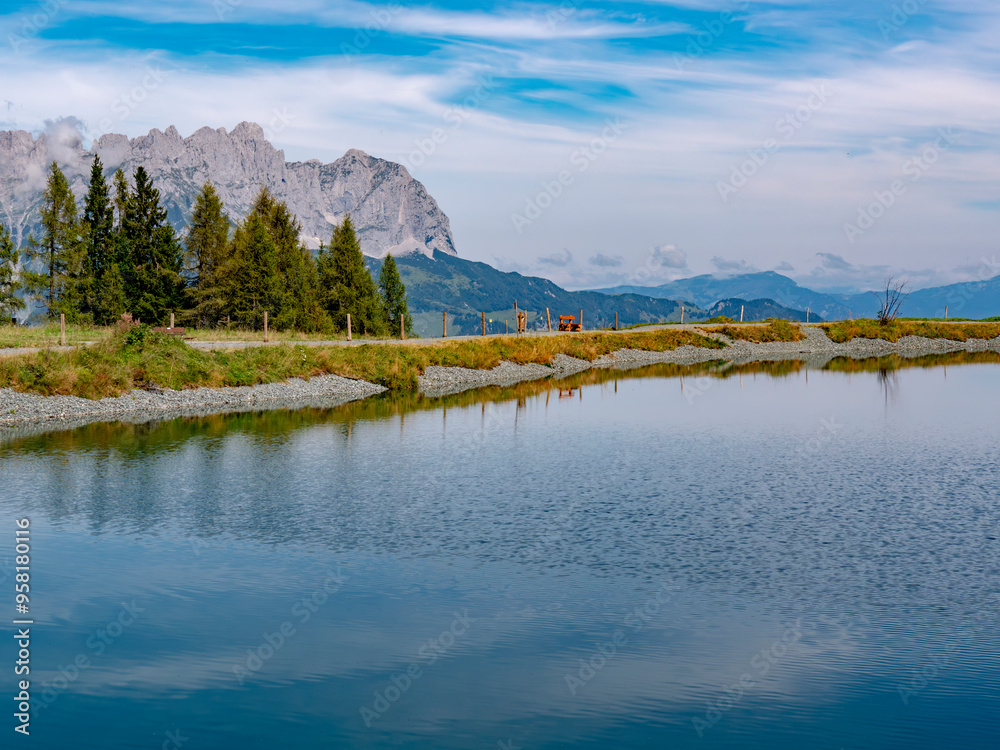 Idyllisches Bergpanorama mit blauem Himmel und Blick auf den Wilden Kaiser