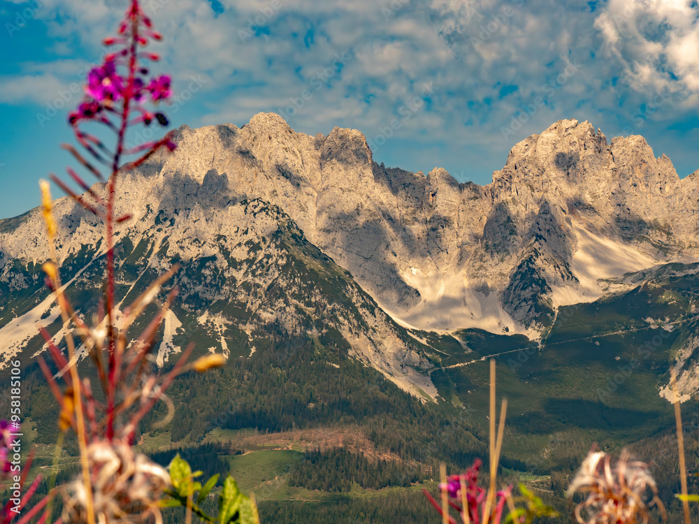Idyllisches Bergpanorama mit blauem Himmel und Blick auf den Wilden Kaiser