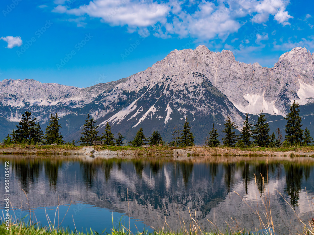 Idyllisches Bergpanorama mit blauem Himmel und Blick auf den Wilden Kaiser