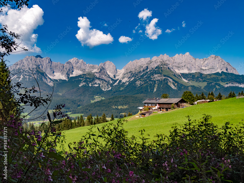 Idyllisches Bergpanorama mit blauem Himmel und Blick auf den Wilden Kaiser