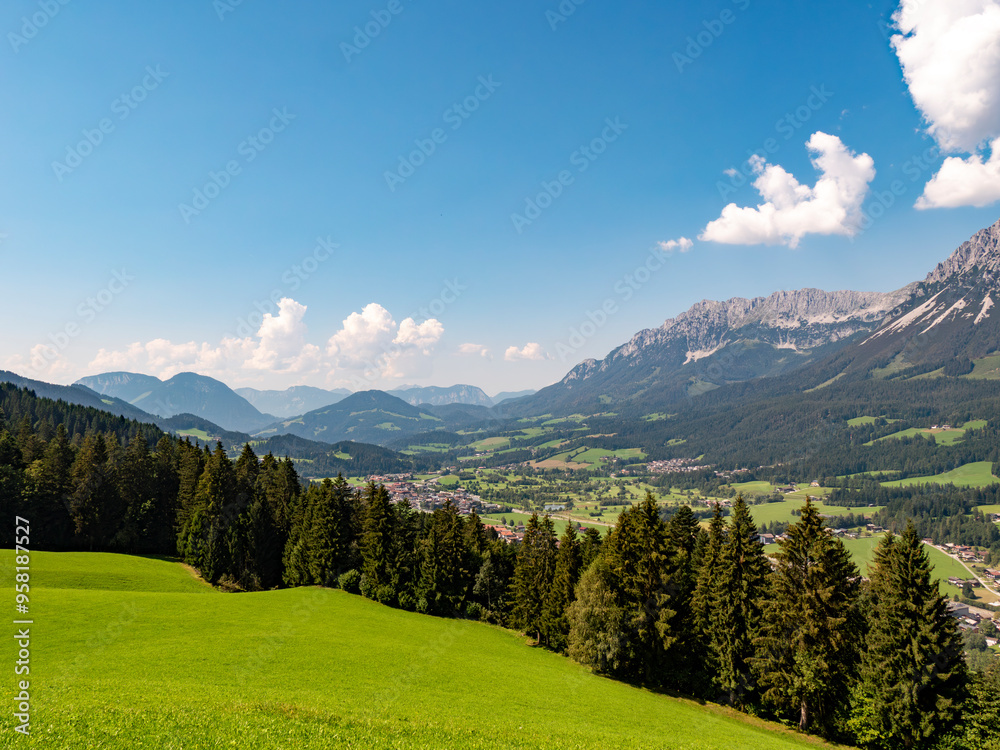 Idyllisches Bergpanorama mit blauem Himmel und Blick auf den Wilden Kaiser