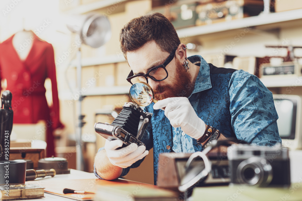 Collector checking vintage items in his store