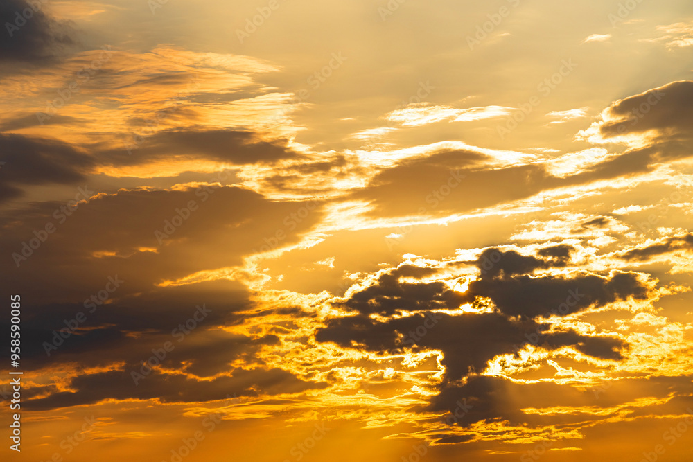 the evening sky illuminated by the sun hidden behind a cloud. evening sky with clouds and sun. the setting sun hides behind a cloud