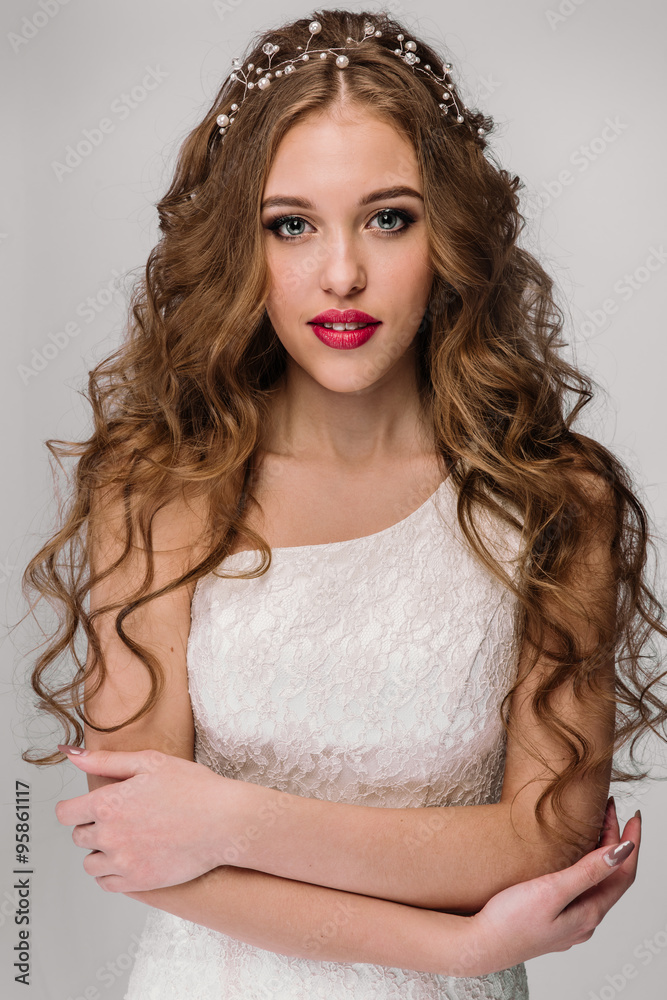 Slim beautiful woman with long hair wearing wedding dress isolated on white