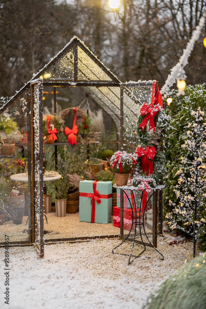 Beautifully decorated backyard with gift boxes, christmas tree and wreaths on winter holidays at backyard