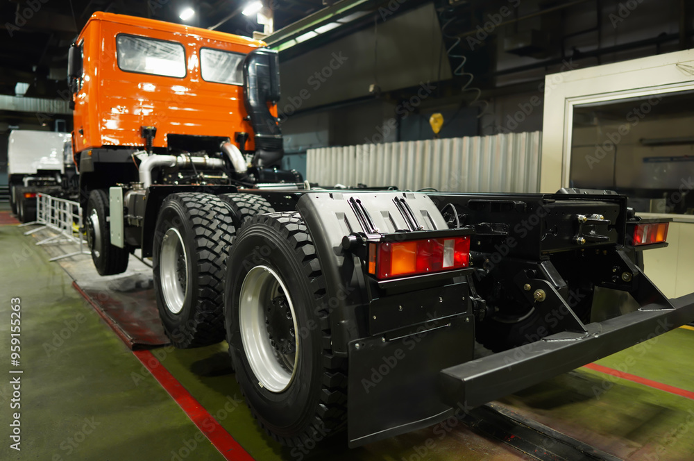 Truck production line. Industrial workshop production of Heavy duty trucks. Trucks Manufacture work. Assembly line inside truck factory. Heavy duty truck plant. Manufacturing Trucks. Body cab of lorry