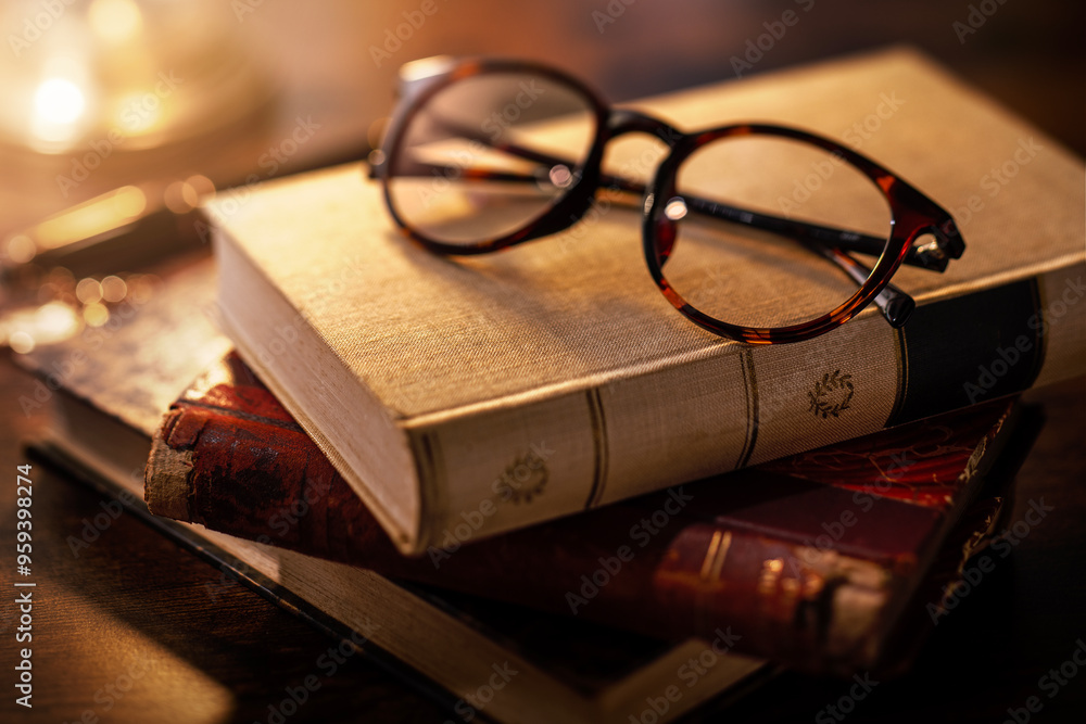 アンティークな木のテーブルの上に積み重ねられた本。