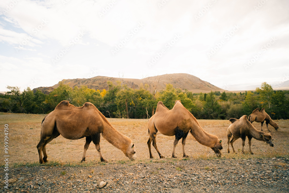 Bactrian camel in the steppes of Mongolia. True to transport a nomad