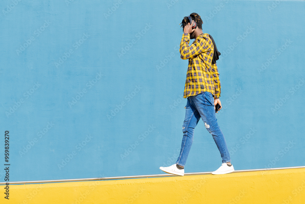 unrecognizable young black man with headphones walking along a yellow wall and a blue wall in the background with his smartphone in his hand, technology and lifestyle concept, copy space for text