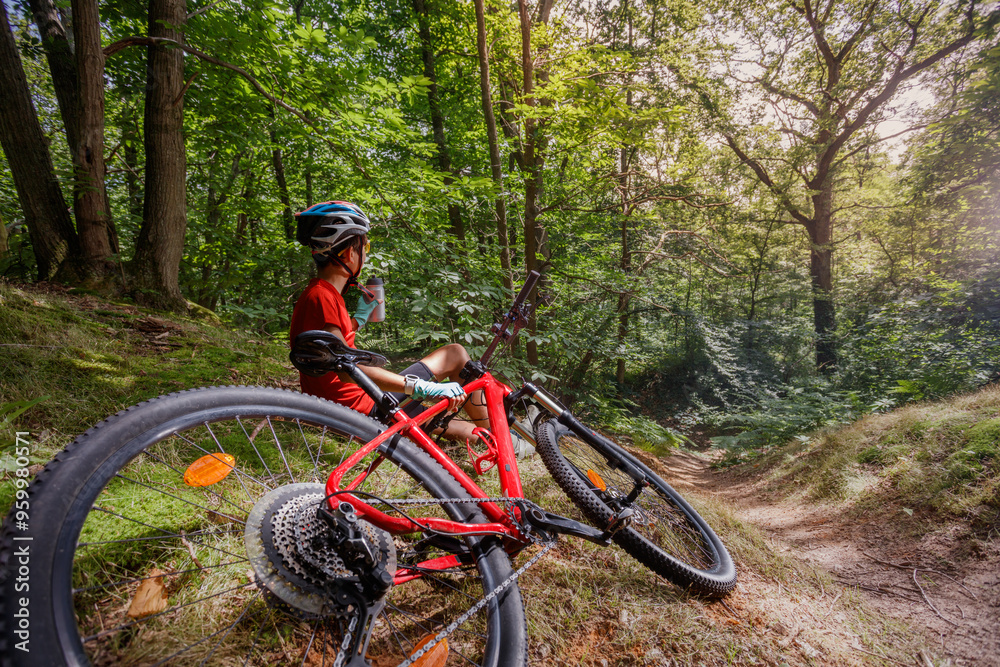 Rest after bike ride, cyclist enjoy view of summer sunny forest