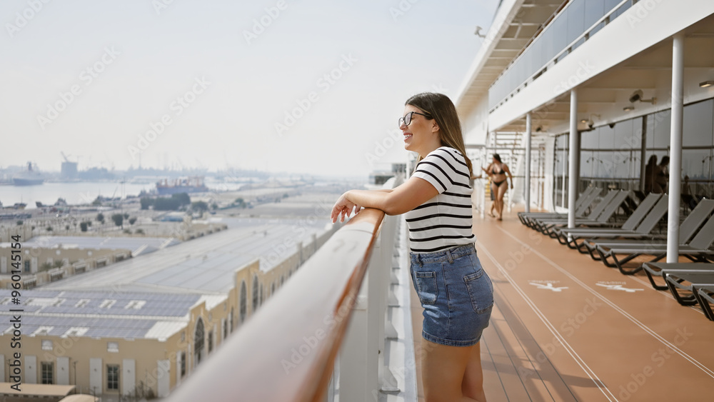 Smiling woman leaning on cruise ship railing overlooking port on sunny day