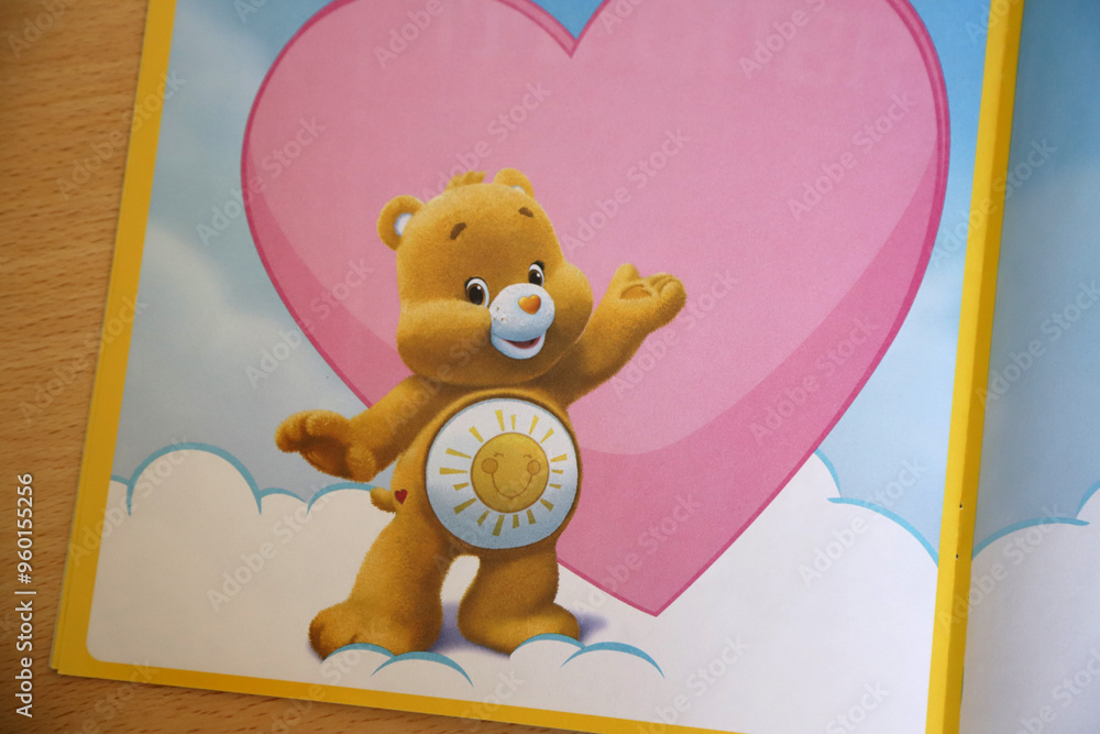 Children's book with the character of Funshire bear. Yellow care bear with heart background with copy space. Template. Card. Mockup. Cartoon for kids.