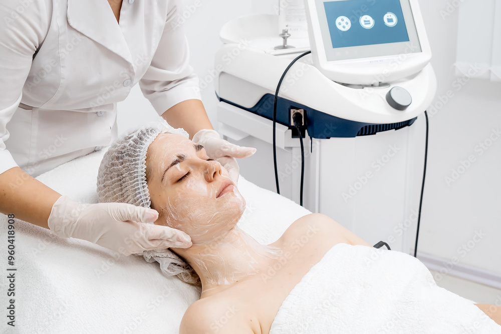 A skilled cosmetologist cleanses a young woman's face with specialized products in a modern beauty salon. This professional treatment promotes radiant skin and rejuvenates your beauty routine.