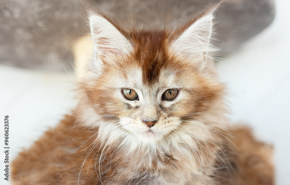 cute tabby maine coon kitten resting on comfortable white fur looking at camera tilting head with copy space