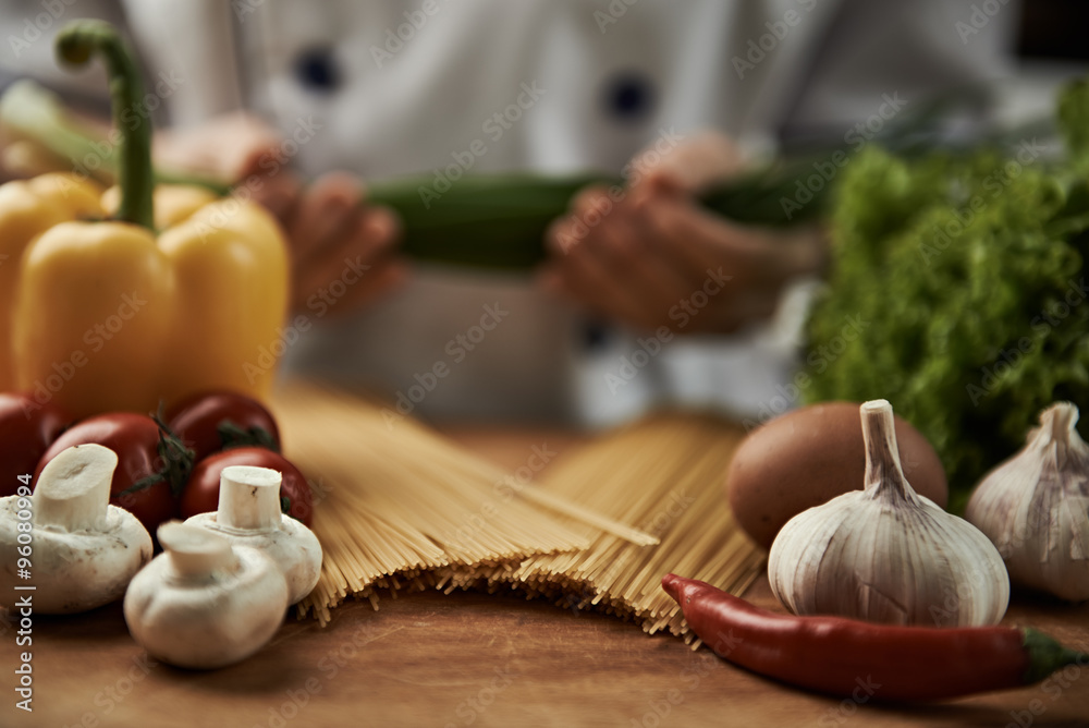 Chef in uniform holding spring onion preparing bolognese with spaghetti.