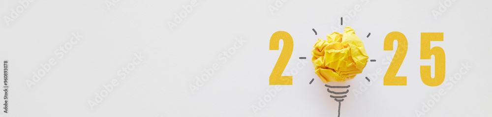2025 with Yellow paper light bulb, innovative business vision and new year resolution concept