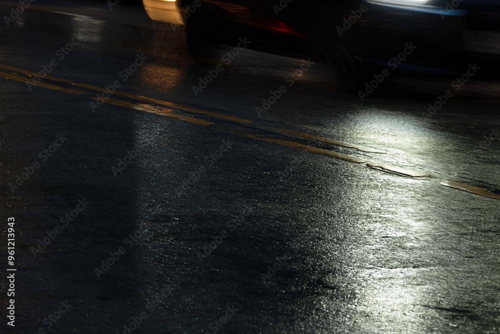 A car is driving down a wet road at night. The reflection of the car is visible in the wet pavement