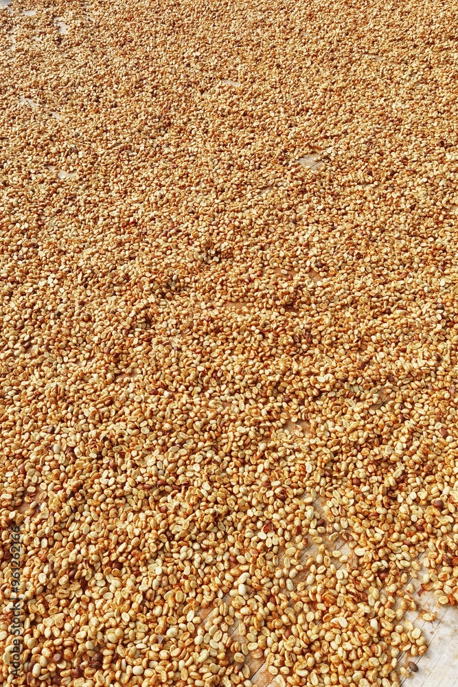 Close up of coffee beans drying in the sun