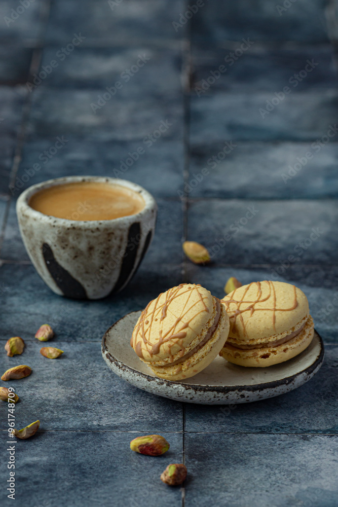 Light brown, beige french macaroons on the blue background with cup of coffee
