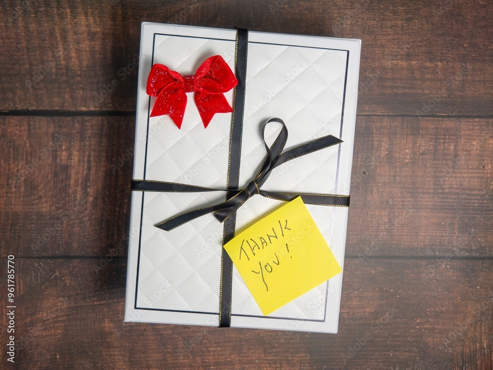 Yellow Thank You Post-it Note on a white gift box with red bow and black ribbon on a wood background