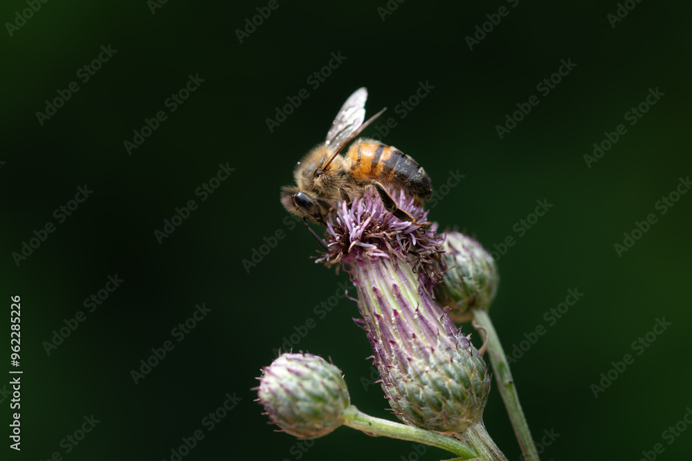 Close-up of a small honeybee sitting on the flower of a thistle. The background is green. There is space for text.