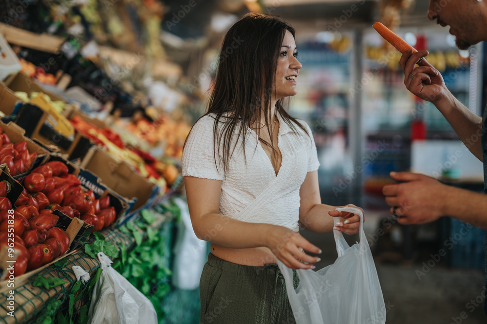 A group of friends enjoying a day out shopping for fresh fruits and vegetables at a local greengrocer. The atmosphere is lively and engaging, promoting healthy lifestyles.