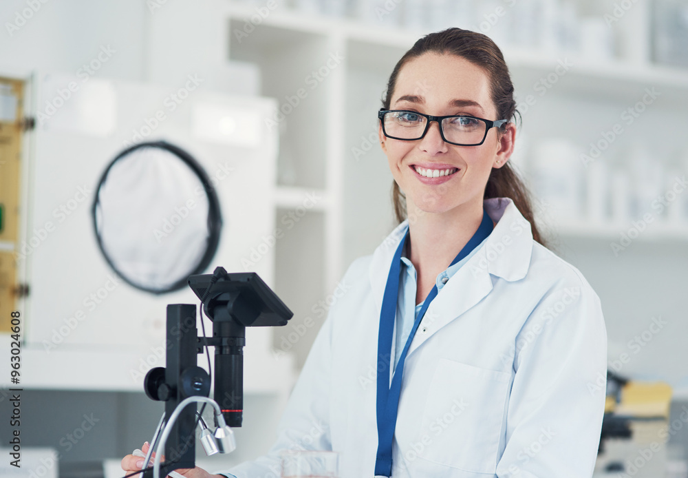 Medical, science and portrait of woman in laboratory with smile for vaccine development in research study. Biotech engineer, technician or confident scientist in office for pharmaceutical innovation