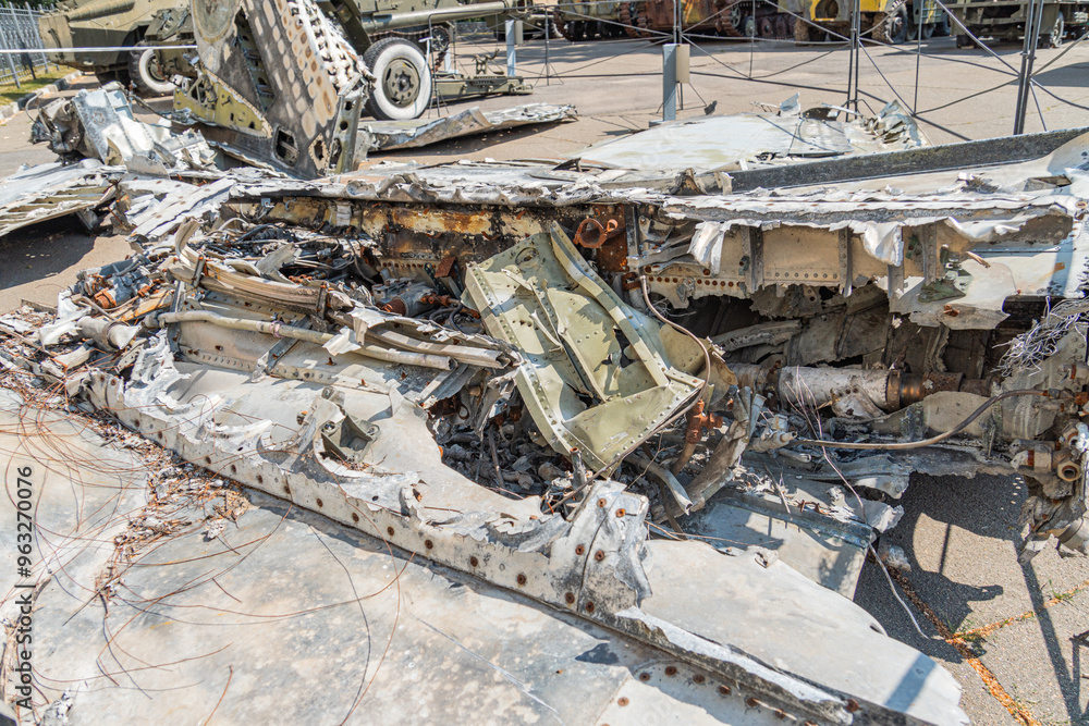 Crashed warplane, Ukrainian fighter jet remains. Texture of the remains of a crashed fighter plane Russian-Ukrainian war. Details of the plane crash
