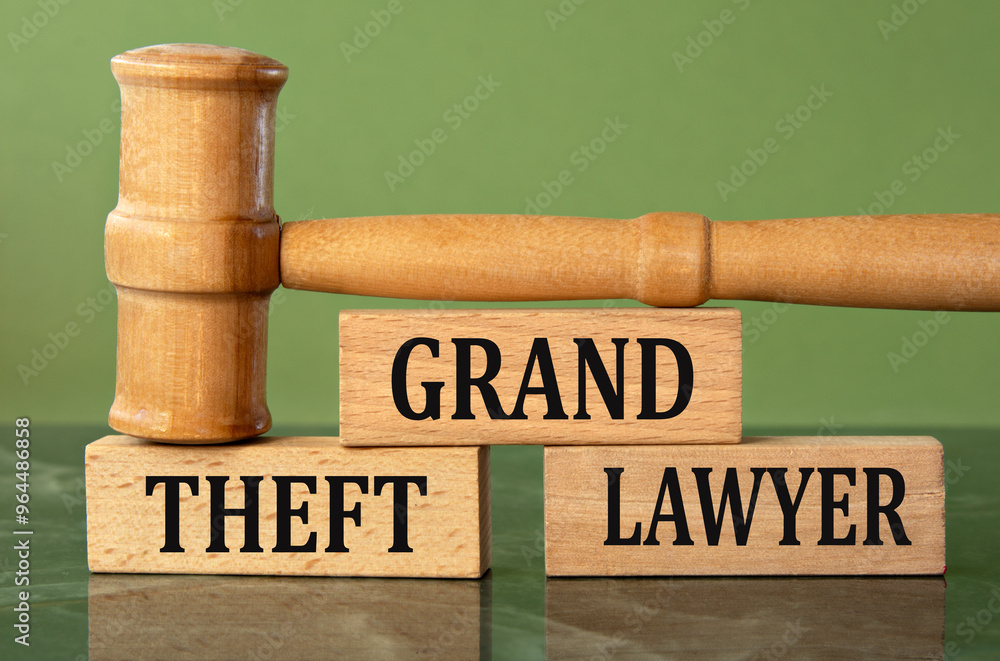 GRAND THEFT LAWYER - words on wooden blocks with a judge's gavel in the background