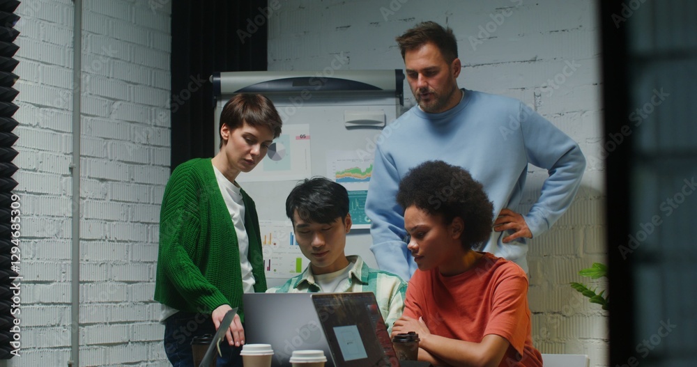 Serious businessman thinking while reviewing document at office desk. Professional wearing glasses focused on paperwork with laptop in front. Calm environment reflects dedication, concentration
