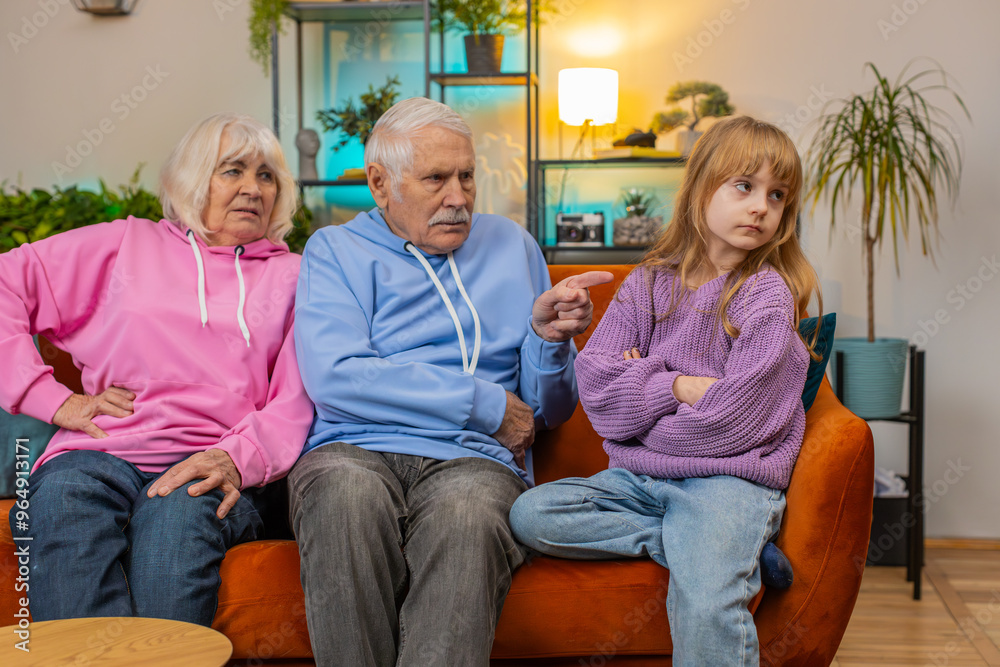 Angry grandfather and grandmother scolding granddaughter for bad behavior and disobedience on sofa, raising voice, scream at little grandchild. Difficulties of upbringing, misbehaved child concept