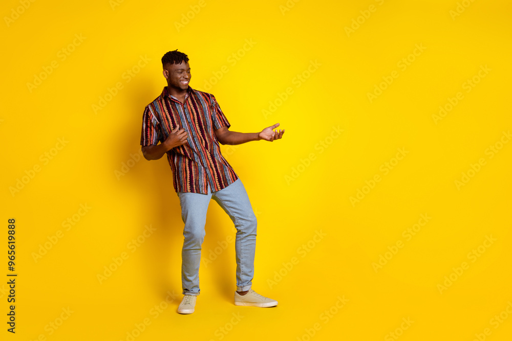 Full body portrait of nice young man dance play imagine guitar wear shirt isolated on yellow color background