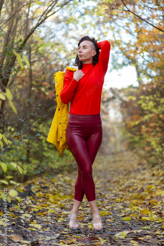 A young woman in a yellow raincoat and leather pants poses in the autumn forest
