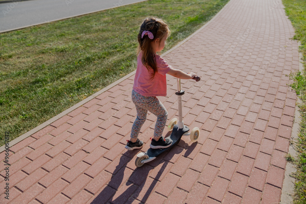 Small three year old toddler girl with long hair riding small scooter on pavement road while learning new activities