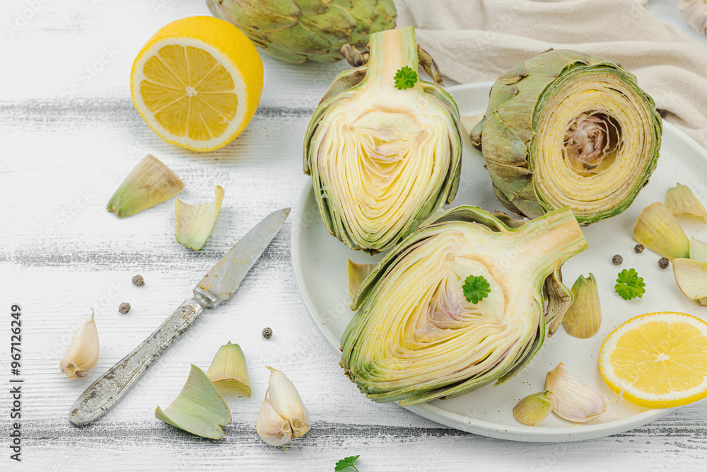 Fresh green artichokes cooking on wooden background. Traditional seasonal ingredients