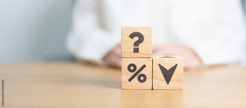 wood block of Question mark with percentage change to UP and Down arrow. Interest rate, GDP, stocks market, financial, deflation and Inflation, ranking, mortgage, debt, Loan and Economic Recession