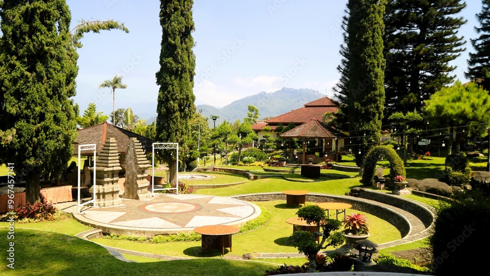 The green outdoor park with a simple stage for performances