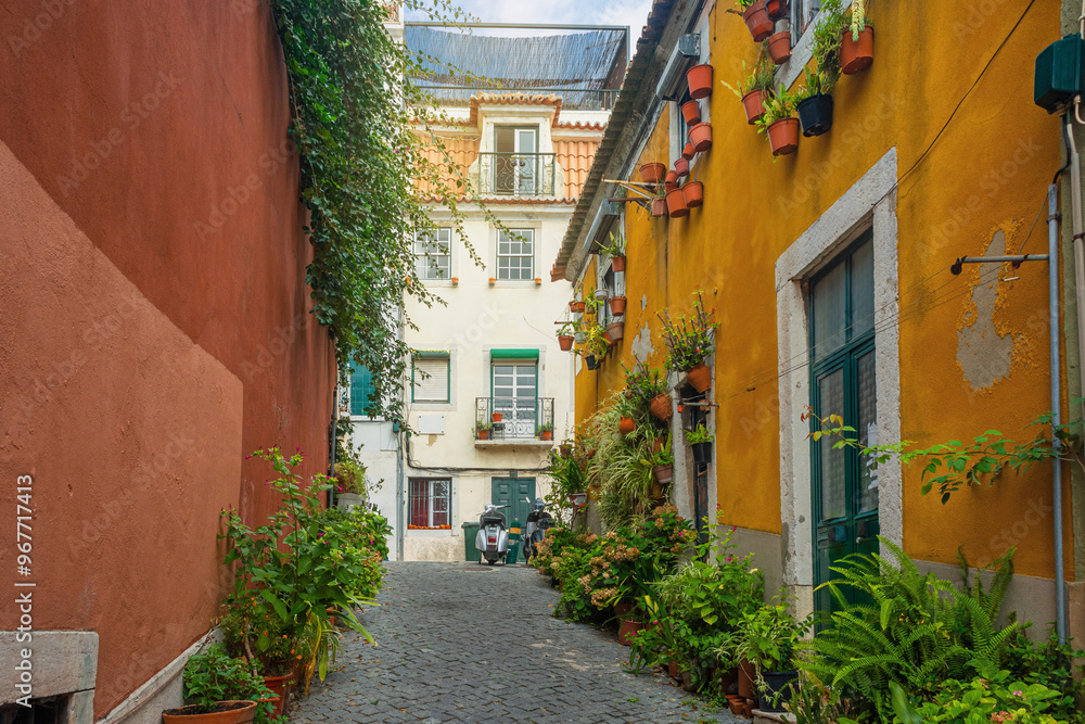 Mediieval narrow street with colorful buildings and potted plants in old town of Lisbon city, Portugal. Cobblestone alley with old houses and flowers in pots in Lisboa. Popular touristic destination