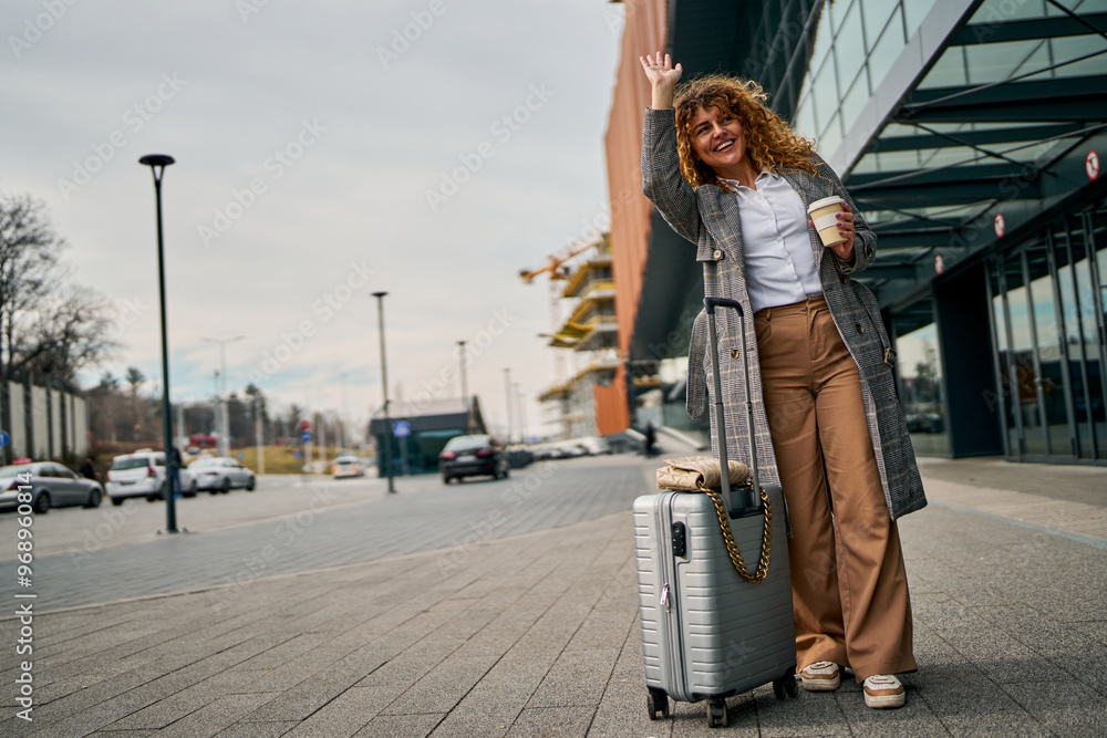 After the flight, a curly-haired redhead outside the airport raises her hand, signaling for a taxi with her suitcase.