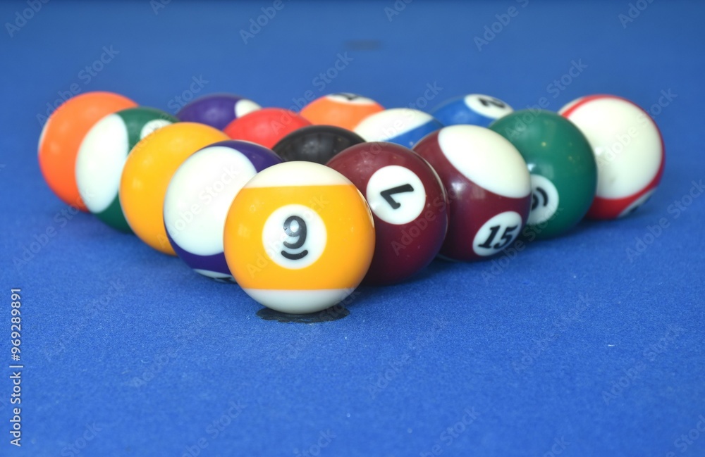 billiard ball with number arranging ready for playing on blue pool table