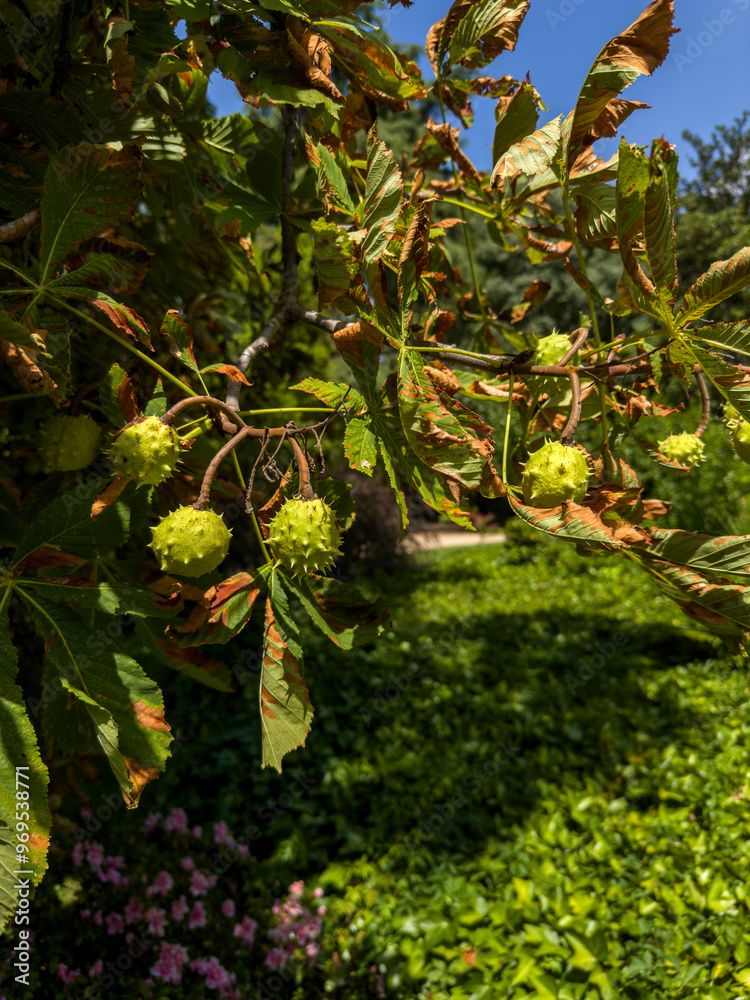 dojrzewające w słońcu kasztany i żółknące liście zapowiadają początek jesieni