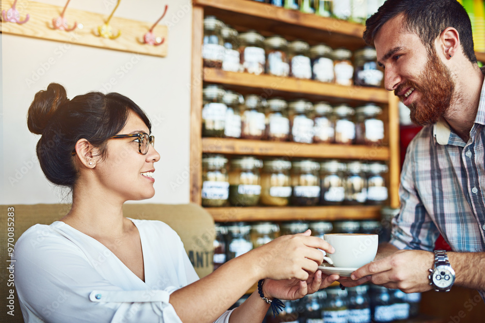 Cafe, woman and man with coffee, service and waiter with smile for customer, happy or relax in morning. Hospitality, serving and people with tea, glasses and flirting in store or love at first sight