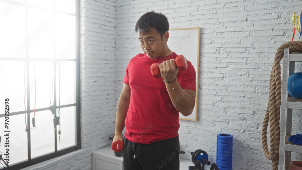 A handsome young chinese man in a gymnasium focuses on lifting red dumbbells, showcasing indoor fitness training with gym equipment in an organized sports center.
